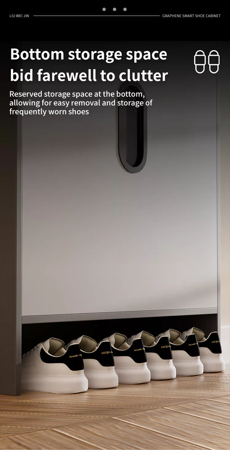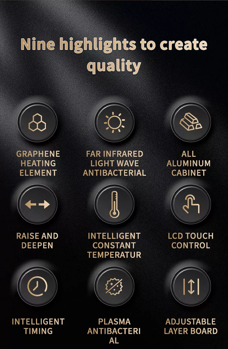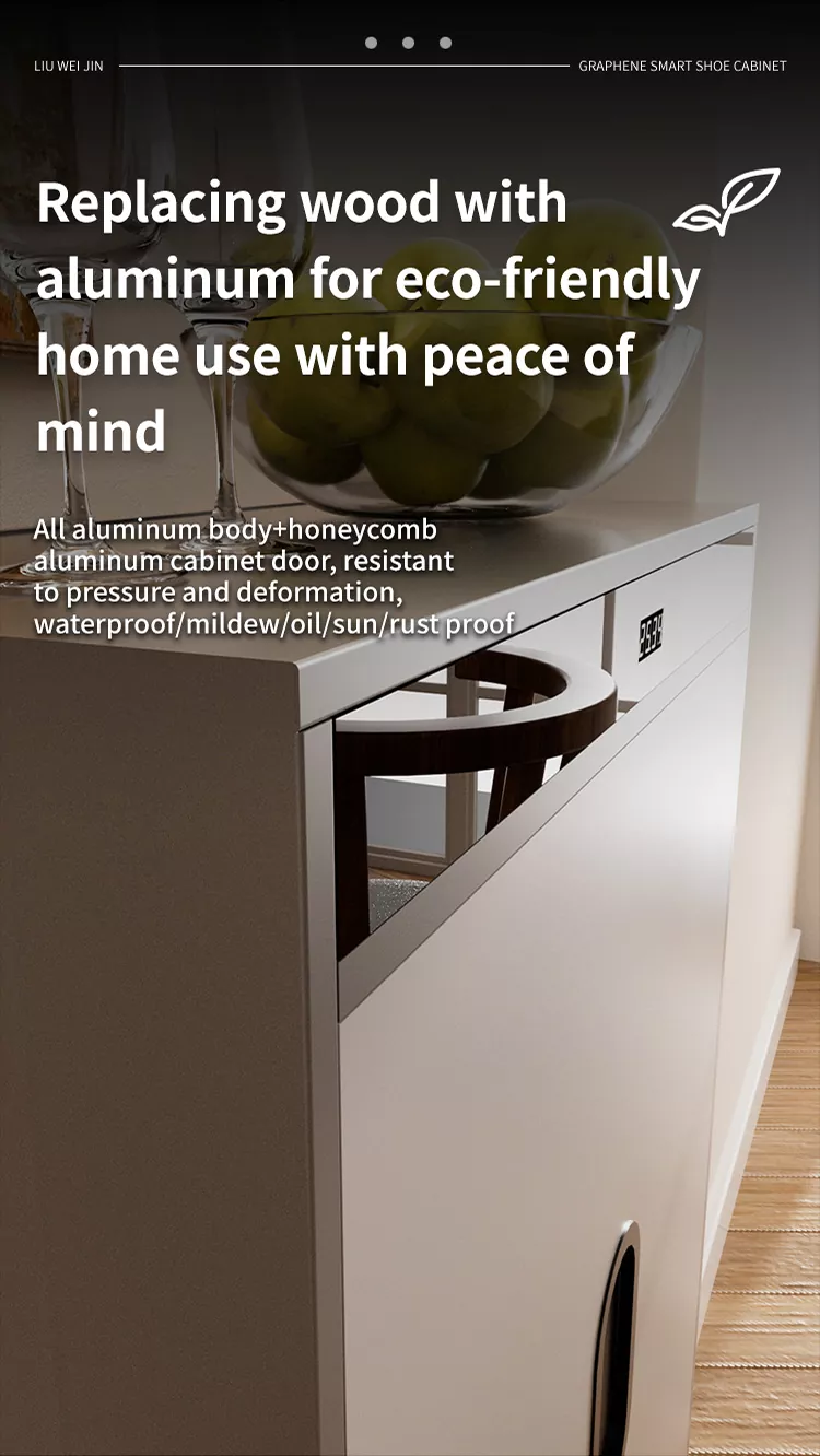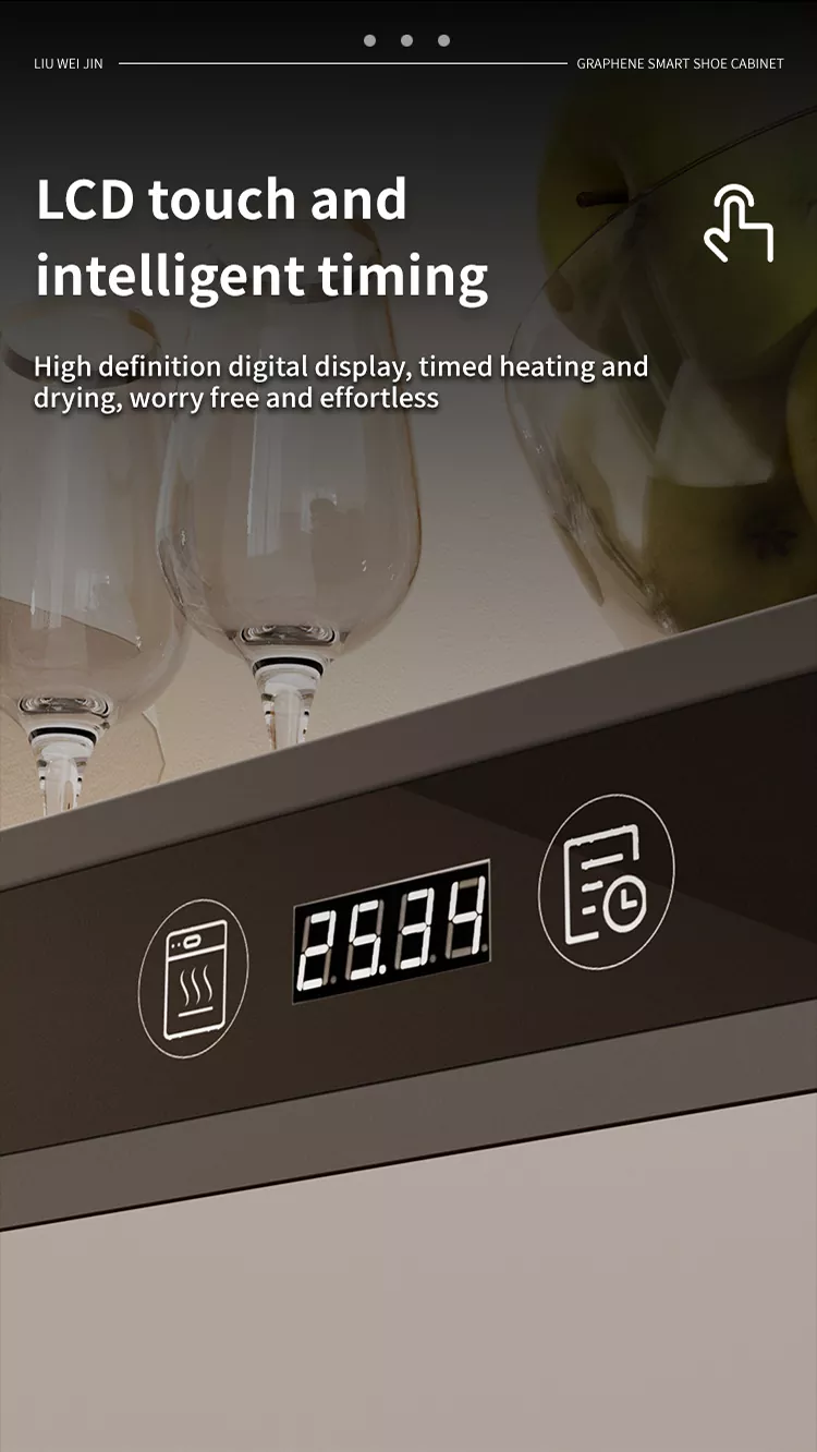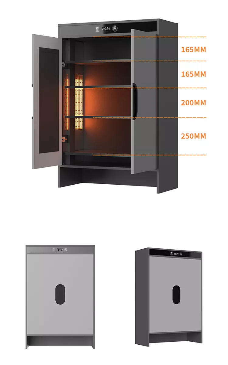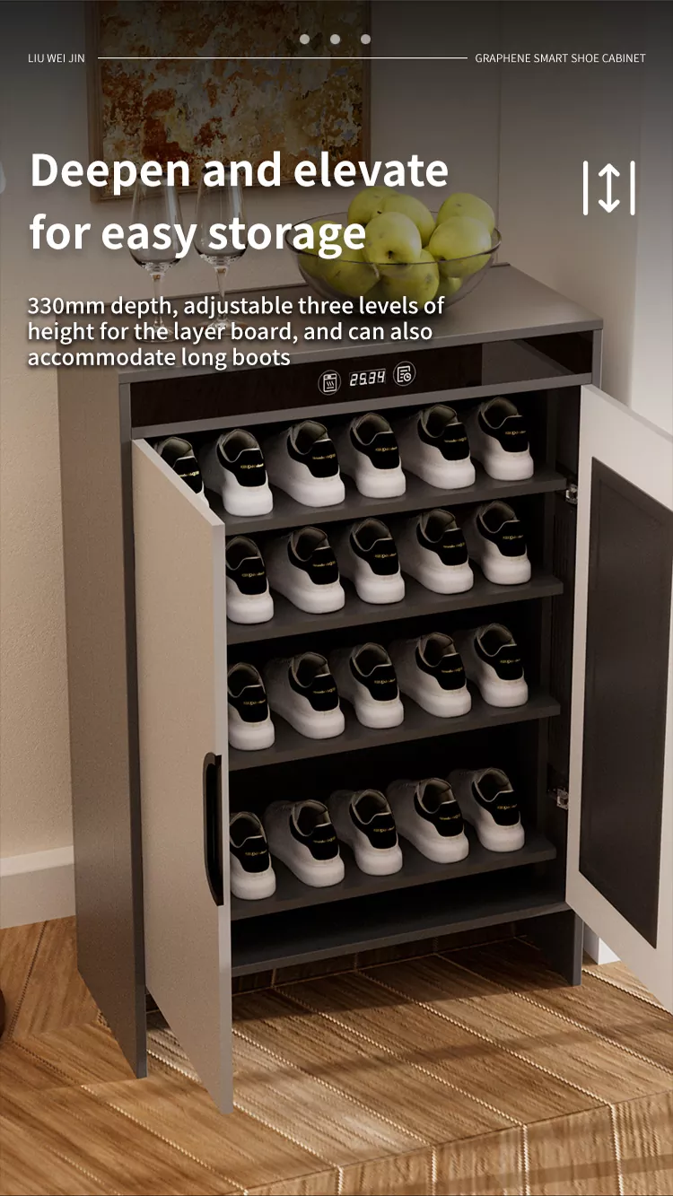 Този Liuwei Jinshi Graphene Electric отопление време за изсушаване на обувките използва графен отоплителен елемент и алуминиево тяло на шкафа, за да поддържа интелигентно време. Размерът е персонализиран и ламинатът е регулируем. Графен топлинният елемент освобождава далеч инфрачервена светлинна вълна за ефективно устойчивост на бактерии, дезодоризиране и бързо сухо. В добавянето има модул за пречистване на йони за елиминиране на миризмите.