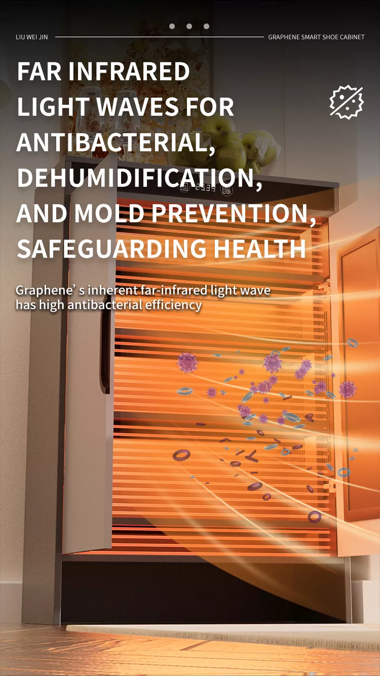 Като пионер на Graphene Life, Meshow поддържа концепцията за „нови материали, нови технологии и нов живот“. Този графен електрическо отопление на отоплението е персонализиран сушилният шкаф за обувки. Този продукт използва елемент на отопление на графен. Графенът е известен като черно златен материал, който е естествен материал, отделен от въглеродните атоми. Той има характеристиките на бързото отопление на милисекунда, а графенът има далеч инфрачервени светлинни вълни, благоприятни за човешкото тяло, което може ефективно да се стерилизира при нагряване. В същото време няма да доведе до това, че въздухът е прекалено сух и ще повреди обувките. Той е оборудван с модул за пречистване на йони, който има ефект на дезодоризация. Две модули за отопление на графен с голяма зона са проектирани от лявата и дясната страна на шкафа за обувки, които могат да бъдат добре и равномерно изсушени. Вижте температурата и работното време, а също така спестете електричество за вас. Шкафът за обувки е изработен от алуминиева плоча с високо якост, която е екологична и формалдехид без. В същото време той има висок капацитет за носене на товар и няма да се макира поради влажно време. Няма да се напука поради дългосрочно отопление.