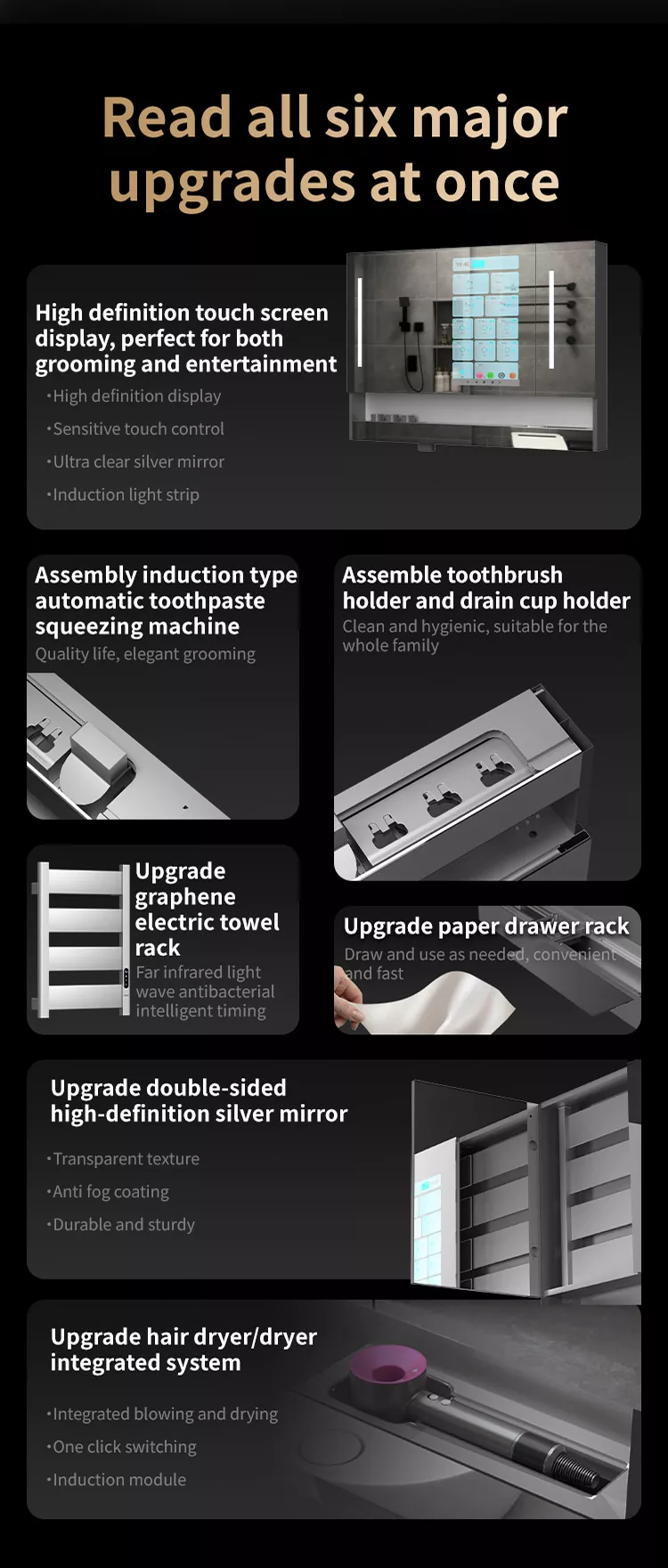 Led lamp strip, automatic toothpaste squeezing machine, tooth cup draining rack, tooth cup toothbrush ultraviolet disinfection device, embedded paper drawing box, hair dryer/dryer dual-purpose conversion device, mirror high-definition display touch screen, mirror defogging system, shaver sterilization, towel rack ion purification, induction hand sanitizer module, integrated control center, graphene heating and drying towel rack, intelligent Система за аромати, система за пречистване на въздуха
