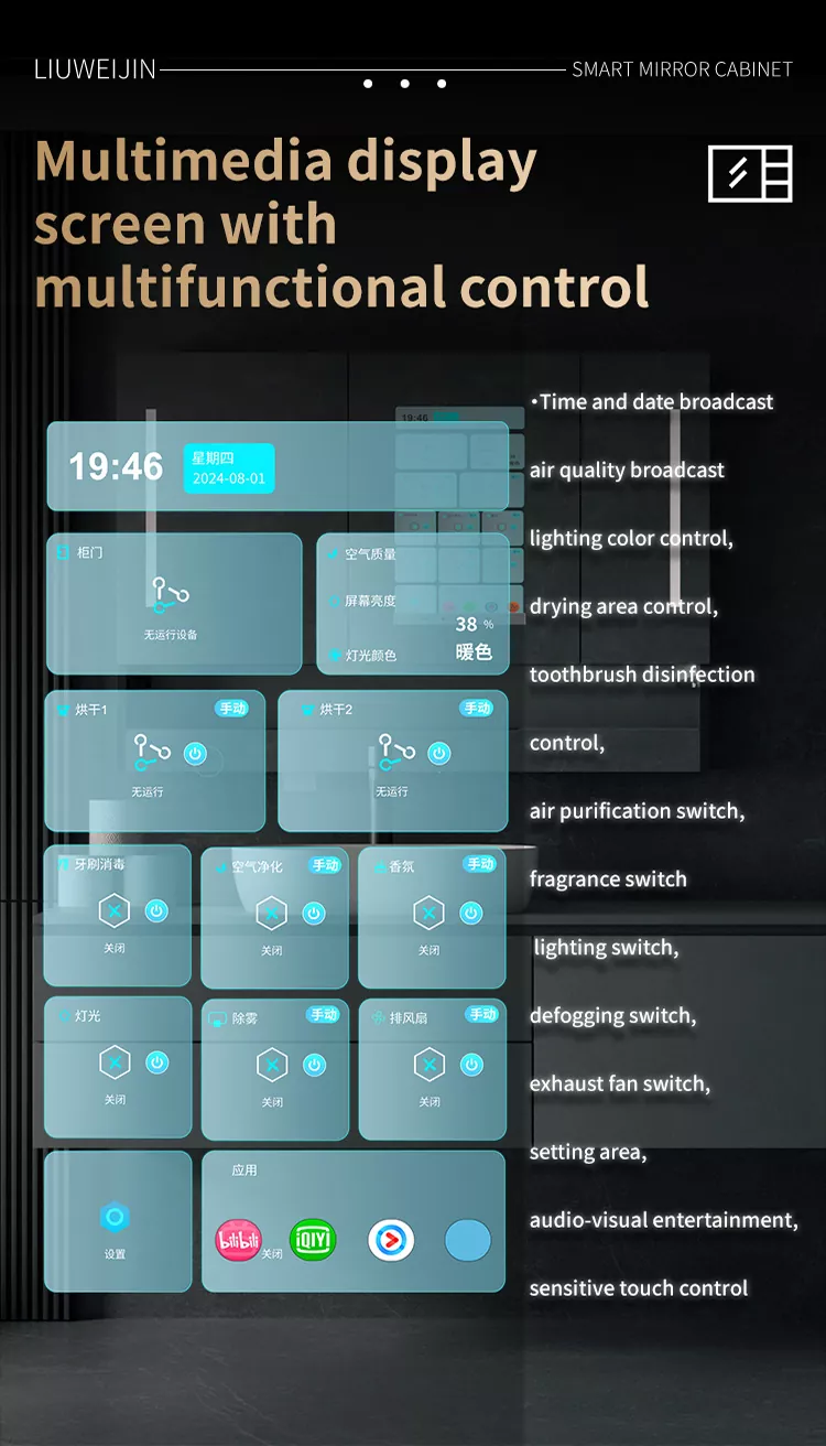 This Liuwei Jinshi Graphene Smart Bath Mirror Cabinet is made of alloy material, which is durable and moisture-proof.Standard led light strip, automatic toothpaste squeezing machine, tooth cup draining rack, tooth cup toothbrush ultraviolet disinfection device, shaver disinfection device, embeddedPaper drawer, dual-purpose conversion device for hair dryer/dryer, mirror high-definition display touch screen, Индукционен дезинфектант за ръце, огледална система за дефиниране, контрол на типа Ченг. Луксозният модел е оборудван с графен отопление и сушене на багажника за кърпи, интелигентна система за аромати и система за пречистване на въздуха. В допълнение, големият екран поддържа аудио и видео забавления, време и време за време, изтегляне на приложения и т.н., за да обогатите живота си.